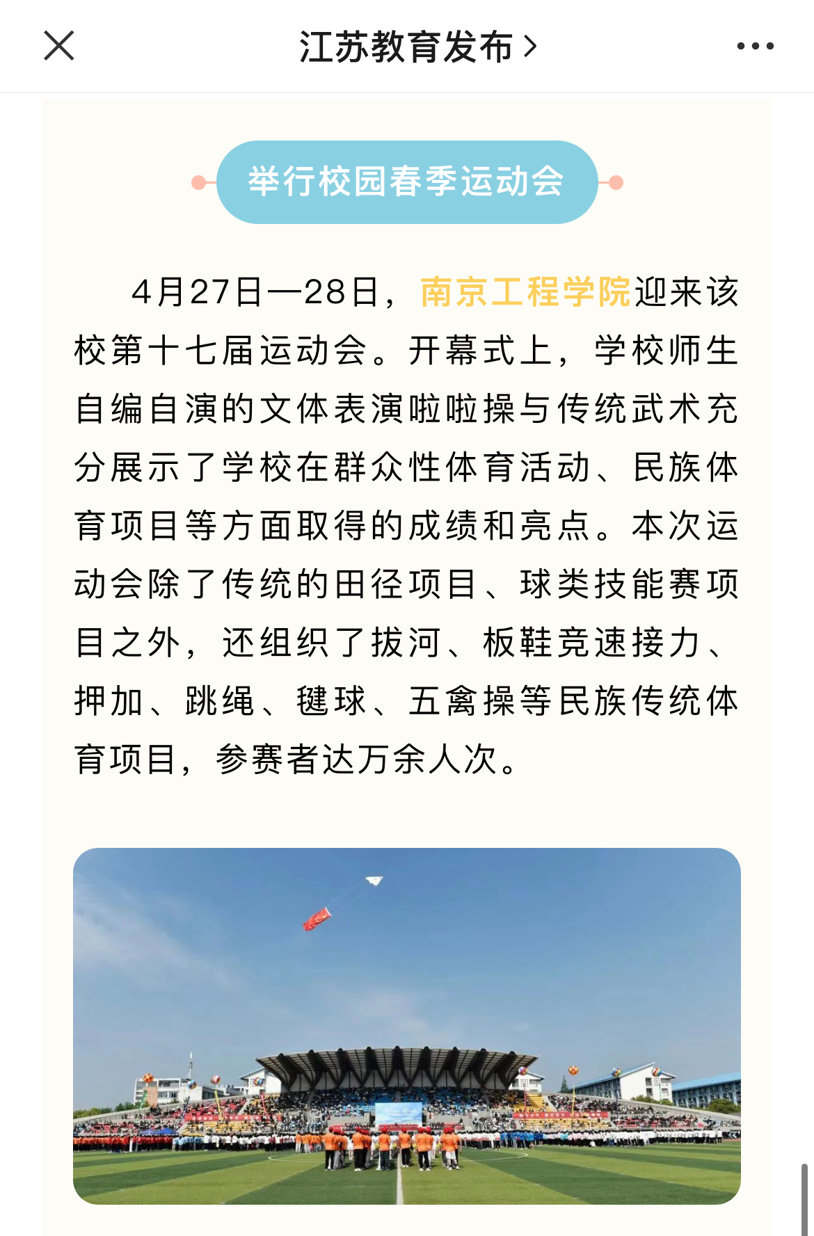 4月27日—28日,凯发k8官网迎来该校第十七届运动会。开幕式上,凯发师生自编自演的文体表演啦啦操与传统武术充分展示了凯发在群众性体育活动、民族体育项目等方面取得的成绩和亮点。本次运动会除了传统的田径项目、球类技能赛项目之外,还组织了拔河、板鞋竞速接力、押加、跳绳、毽球、五禽操等民族传统体育项目,参赛者达万余人次。