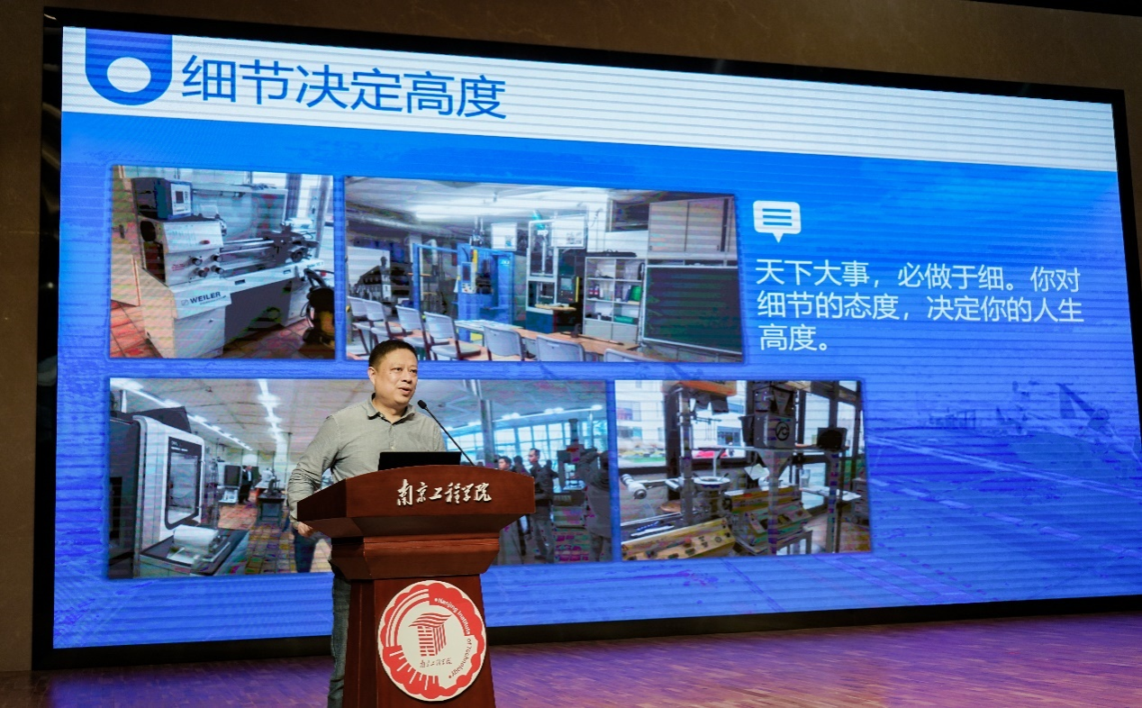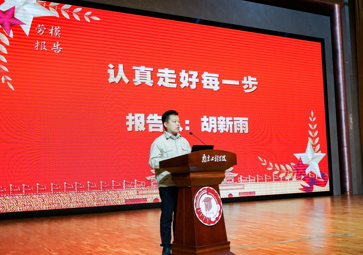 “全国五一劳动奖章”获得者、大国工匠年度人物、中国电子科技集团公司第十四研究所数控车高级技师胡胜,“全国五一劳动奖章”获得者、南京东华汽车实业有限公司副总监、南京法雷奥离合器有限公司副总经理岳鹏祥,“全国五一劳动奖章”获得者、中国电力行业技术能手、国网南通供电公司设备管理部主任胡新雨应邀作为主讲,他们用朴实的语言、动人的案例,与现场师生分享了自己在平凡岗位上执着专注、攻坚克难的感人事迹和成长经历,赢得了现场阵阵掌声。