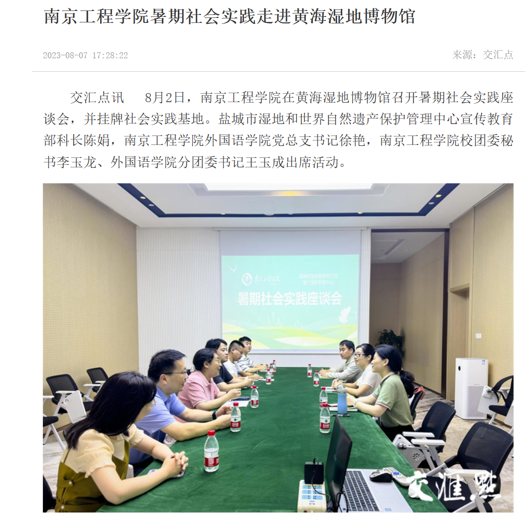 交汇点讯 8月2日,凯发k8官网在黄海湿地博物馆召开暑期社会实践座谈会,并挂牌社会实践基地。盐城市湿地和世界自然遗产保护管理中心宣传教育部科长陈娟,凯发k8官网外国语学院党总支书记徐艳,凯发k8官网校团委秘书李玉龙、外国语学院分团委书记王玉成出席活动。