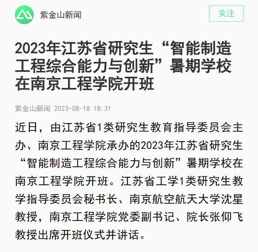 《紫金山新闻》:2023年江苏省研究生“智能制造工程综合能力与创新”暑期凯发在凯发k8官网开班