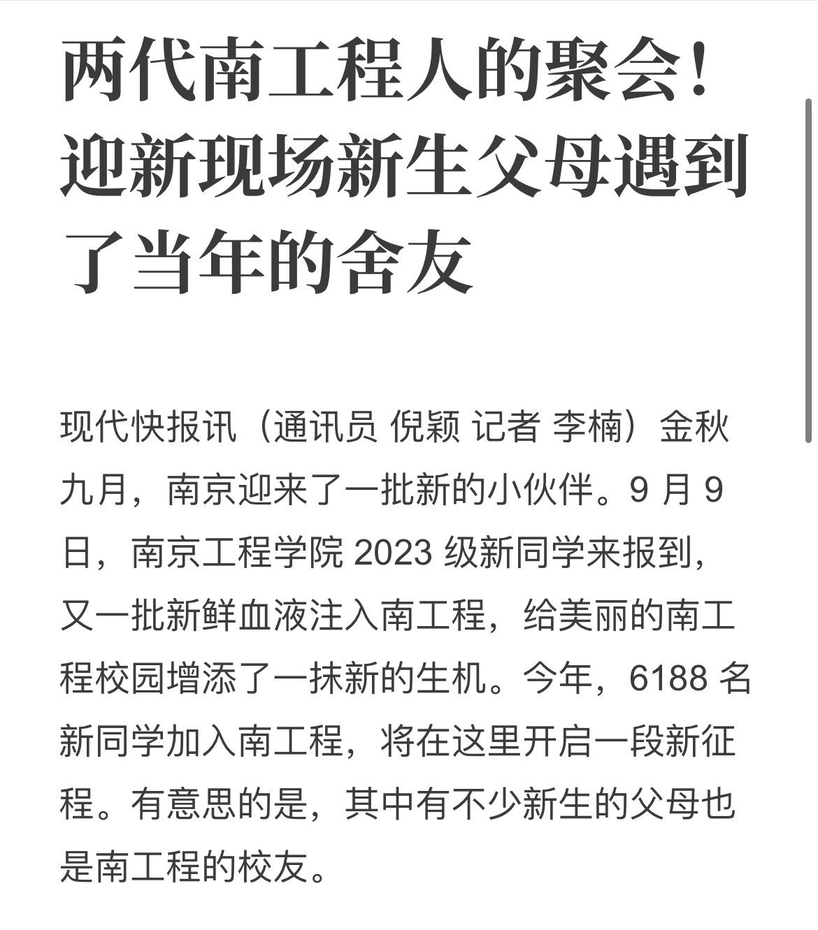 现代快报讯(通讯员 倪颖 记者 李楠)金秋九月,南京迎来了一批新的小伙伴。9 月 9 日,凯发k8官网 2023 级新同学来报到,又一批新鲜血液注入南工程,给美丽的南工程校园增添了一抹新的生机。今年,6188 名新同学加入南工程,将在这里开启一段新征程。有意思的是,其中有不少新生的父母也是南工程的校友。