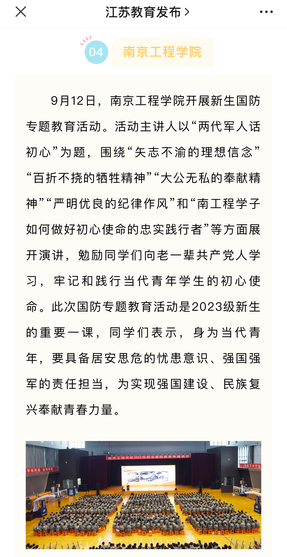 9月12日,凯发k8官网开展新生国防专题教育活动。活动主讲人以“两代军人话初心”为题,围绕“矢志不渝的理想信念”“百折不挠的牺牲精神”“大公无私的奉献精神”“严明优良的纪律作风”和“南工程学子如何做好初心使命的忠实践行者”等方面展开演讲,勉励同学们向老一辈共产党人学习,牢记和践行当代青年学生的初心使命。此次国防专题教育活动是2023级新生的重要一课,同学们表示,身为当代青年,要具备居安思危的忧患意识、强国强军的责任担当,为实现强国建设、民族复兴奉献青春力量。