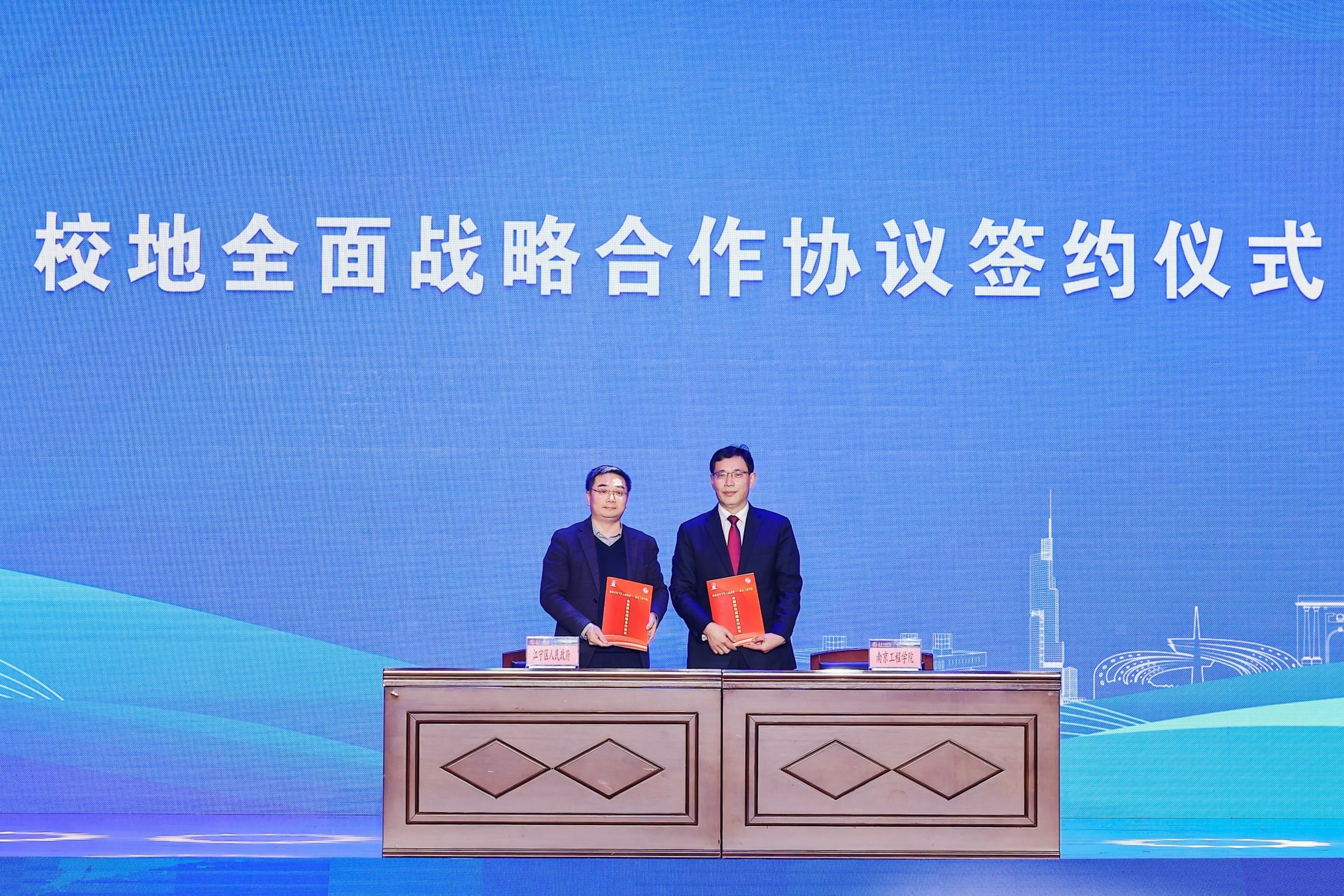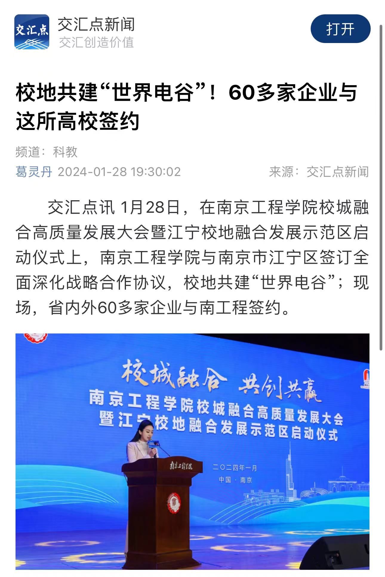 交汇点讯 1月28日,在凯发k8官网校城融合高质量发展大会暨江宁校地融合发展示范区启动仪式上,凯发k8官网与南京市江宁区签订全面深化战略合作协议,校地共建“世界电谷”;现场,省内外60多家企业与南工程签约。