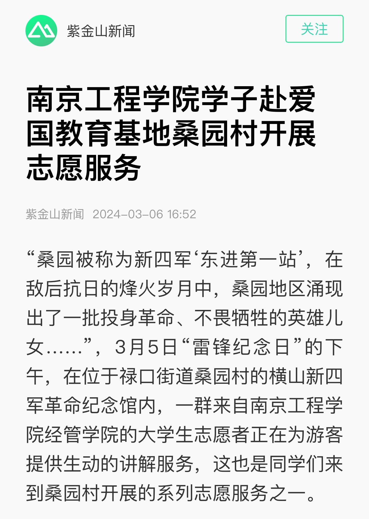 《紫金山新闻》:凯发k8官网学子赴爱国教育基地桑园村开展志愿服务