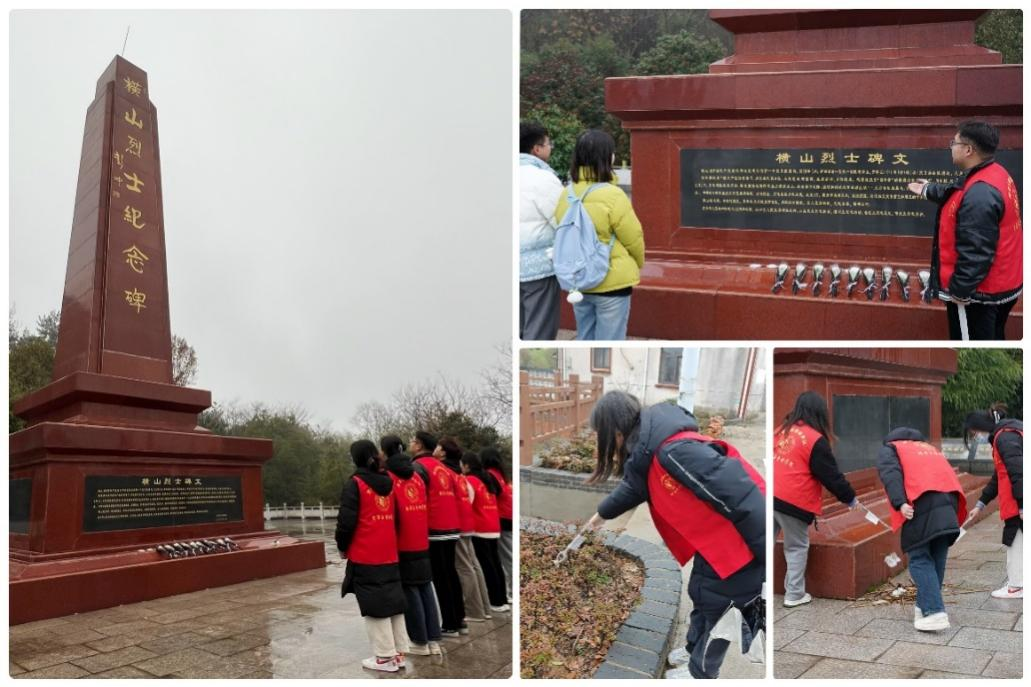 纪念馆的不远处,矗立着横山烈士纪念碑。志愿队员敬献花篮、鞠躬敬礼,认真细致擦拭纪念碑,清理周边杂草,用实际行动表达对英烈们的无限敬仰和缅怀之情。志愿者还与来往游客分享着革命先烈在横山英勇抗日的往事,在革命故事和英雄事迹中,共同追寻红色记忆,铭记革命历史。