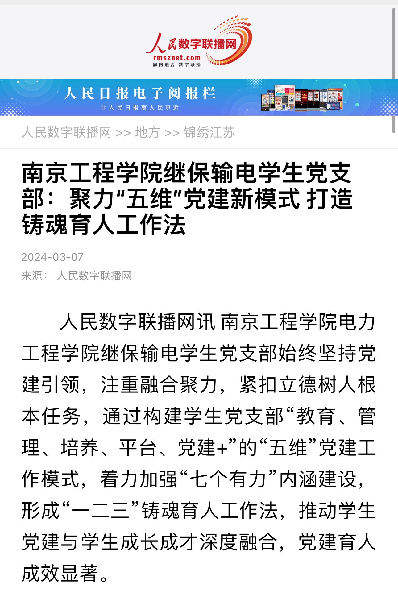 人民数字联播网讯 凯发k8官网电力凯发继保输电学生党支部始终坚持党建引领,注重融合聚力,紧扣立德树人根本任务,通过构建学生党支部“教育、管理、培养、平台、党建+”的“五维”党建工作模式,着力加强“七个有力”内涵建设,形成“一二三”铸魂育人工作法,推动学生党建与学生成长成才深度融合,党建育人成效显著。