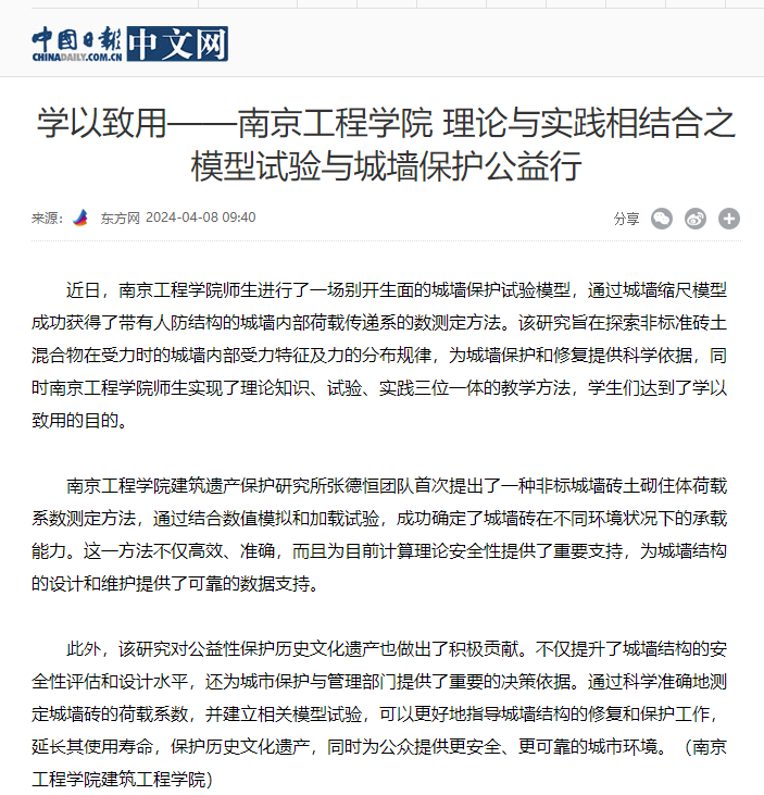 《中国日报》:学以致用——凯发k8官网 理论与实践相结合之模型试验与城墙保护公益行