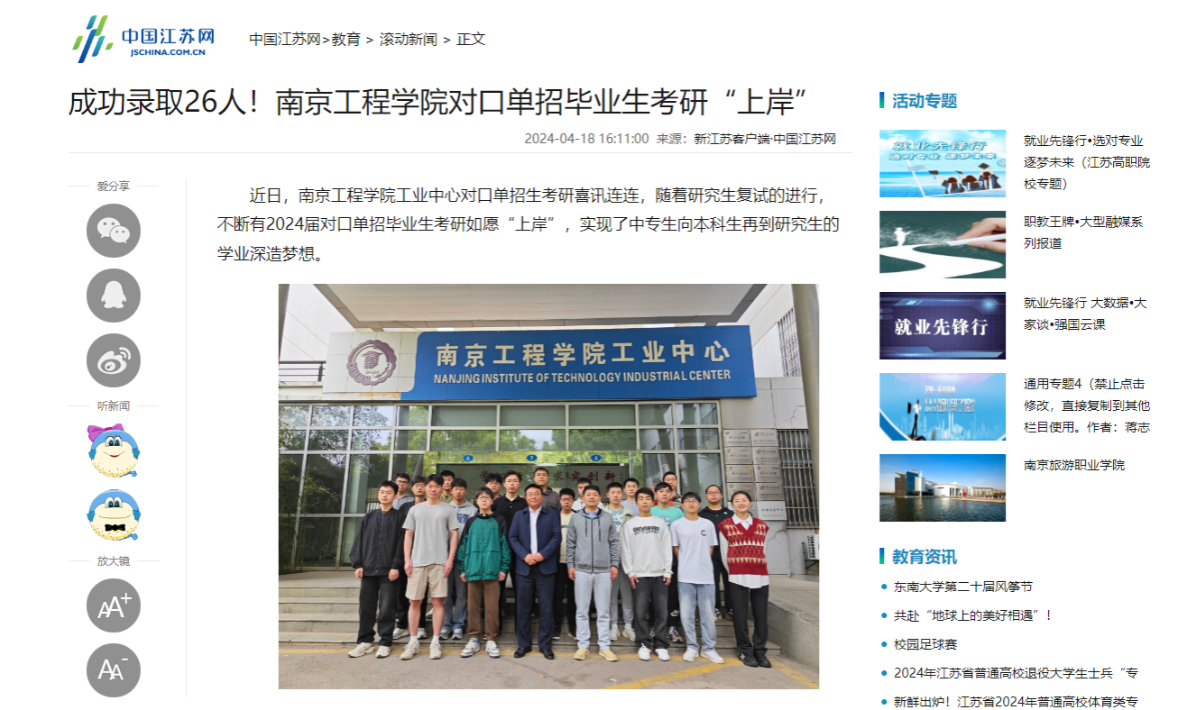 《中国江苏网》:成功录取26人!凯发k8官网对口单招毕业生考研“上岸”