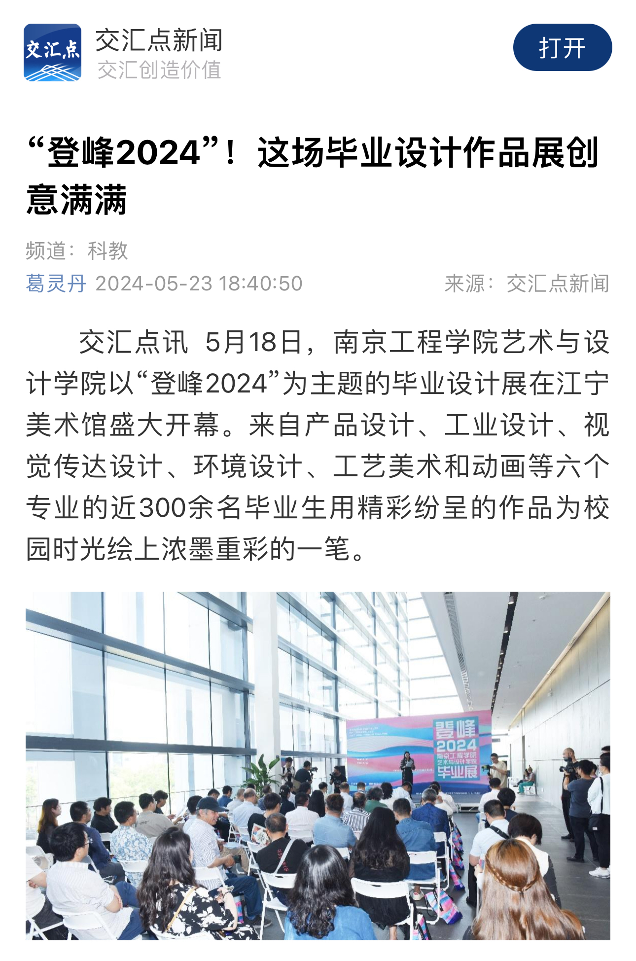 交汇点讯 5月18日,凯发k8官网艺术与设计学院以“登峰2024”为主题的毕业设计展在江宁美术馆盛大开幕。来自产品设计、工业设计、视觉传达设计、环境设计、工艺美术和动画等六个专业的近300余名毕业生用精彩纷呈的作品为校园时光绘上浓墨重彩的一笔。