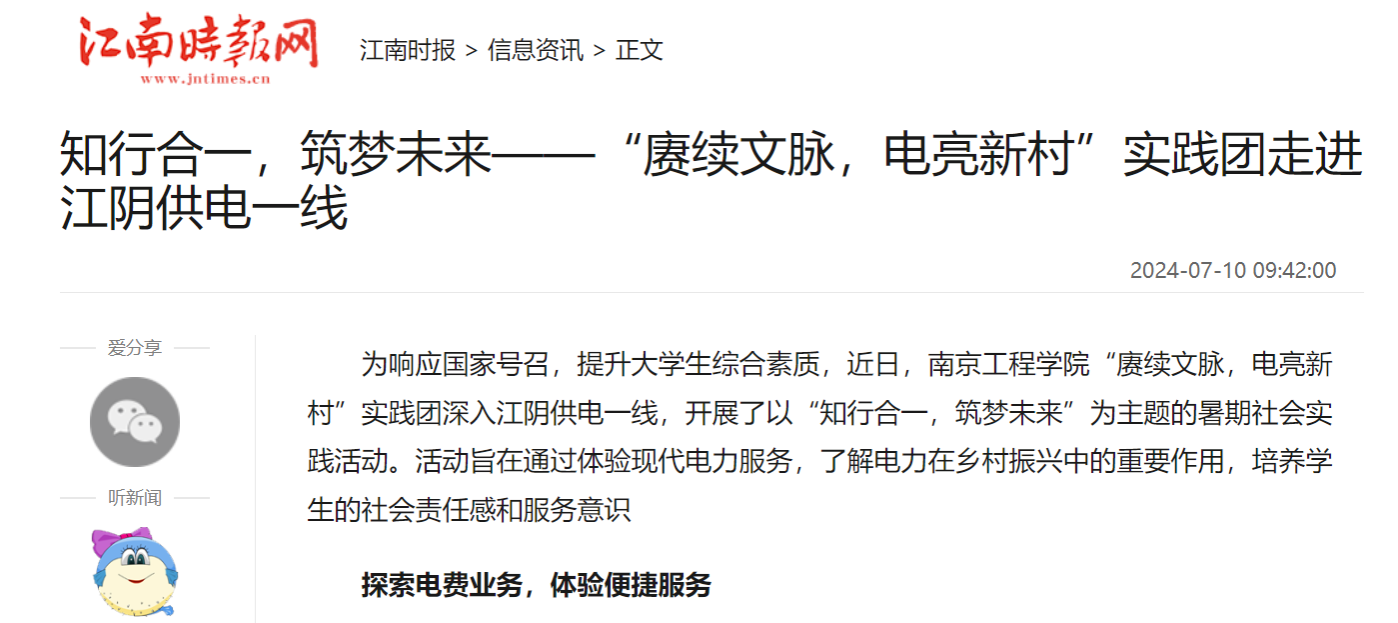 为响应国家号召,提升大学生综合素质,近日,凯发k8官网“赓续文脉,电亮新村”实践团深入江阴供电一线,开展了以“知行合一,筑梦未来”为主题的暑期社会实践活动。活动旨在通过体验现代电力服务,了解电力在乡村振兴中的重要作用,培养学生的社会责任感和服务意识。