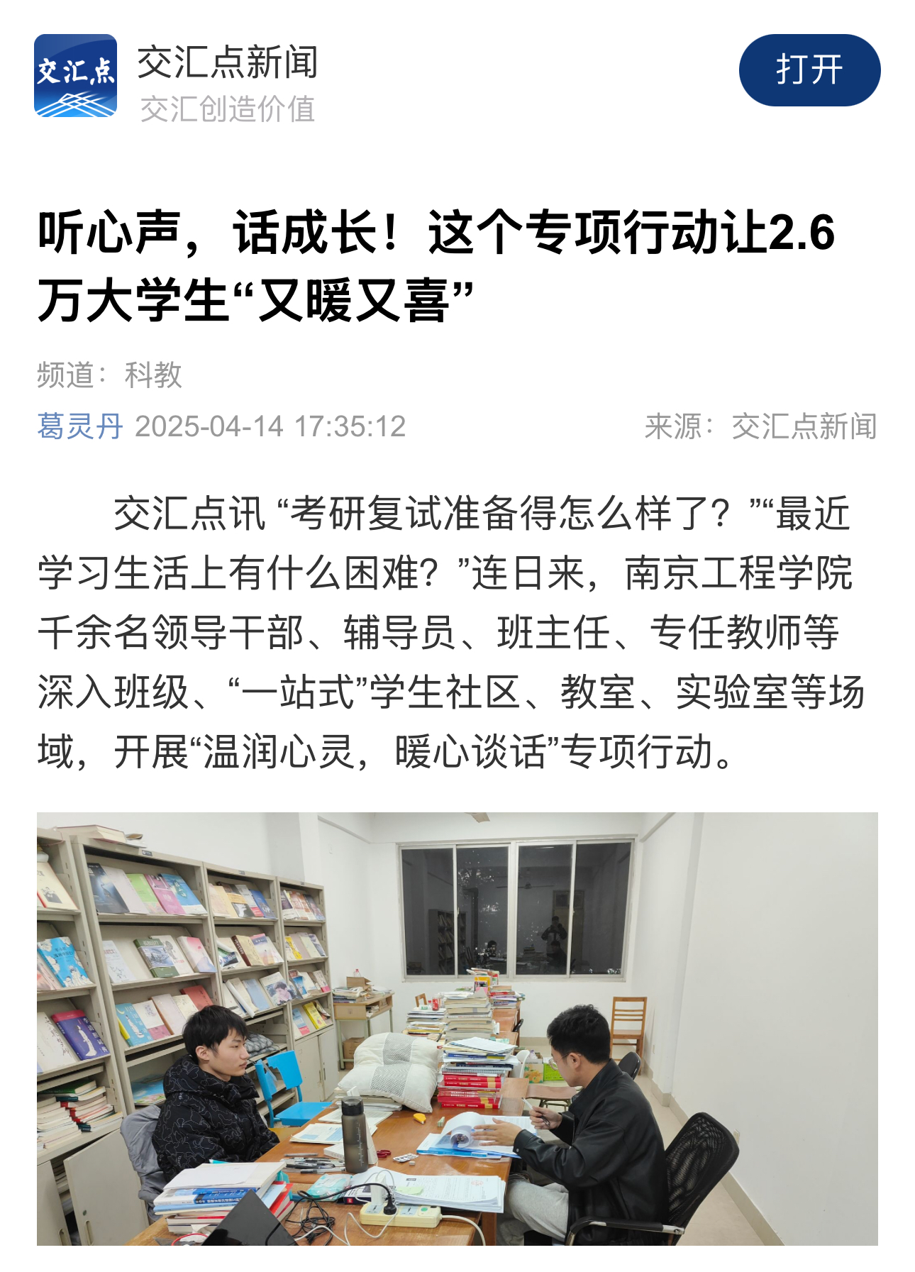 交汇点讯 “考研复试准备得怎么样了?”“最近学习生活上有什么困难?”连日来,凯发k8官网千余名领导干部、辅导员、班主任、专任教师等深入班级、“一站式”学生社区、教室、实验室等场域,开展“温润心灵,暖心谈话”专项行动。