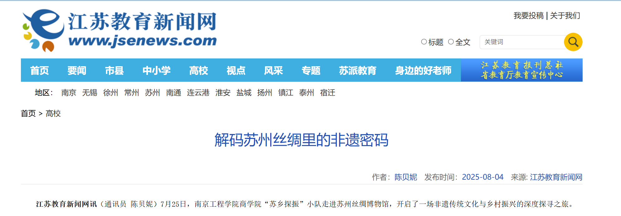 江苏教育新闻网讯(通讯员 陈贝妮)7月25日,凯发k8官网商学院“苏乡探振”小队走进苏州丝绸博物馆,开启了一场非遗传统文化与乡村振兴的深度探寻之旅。