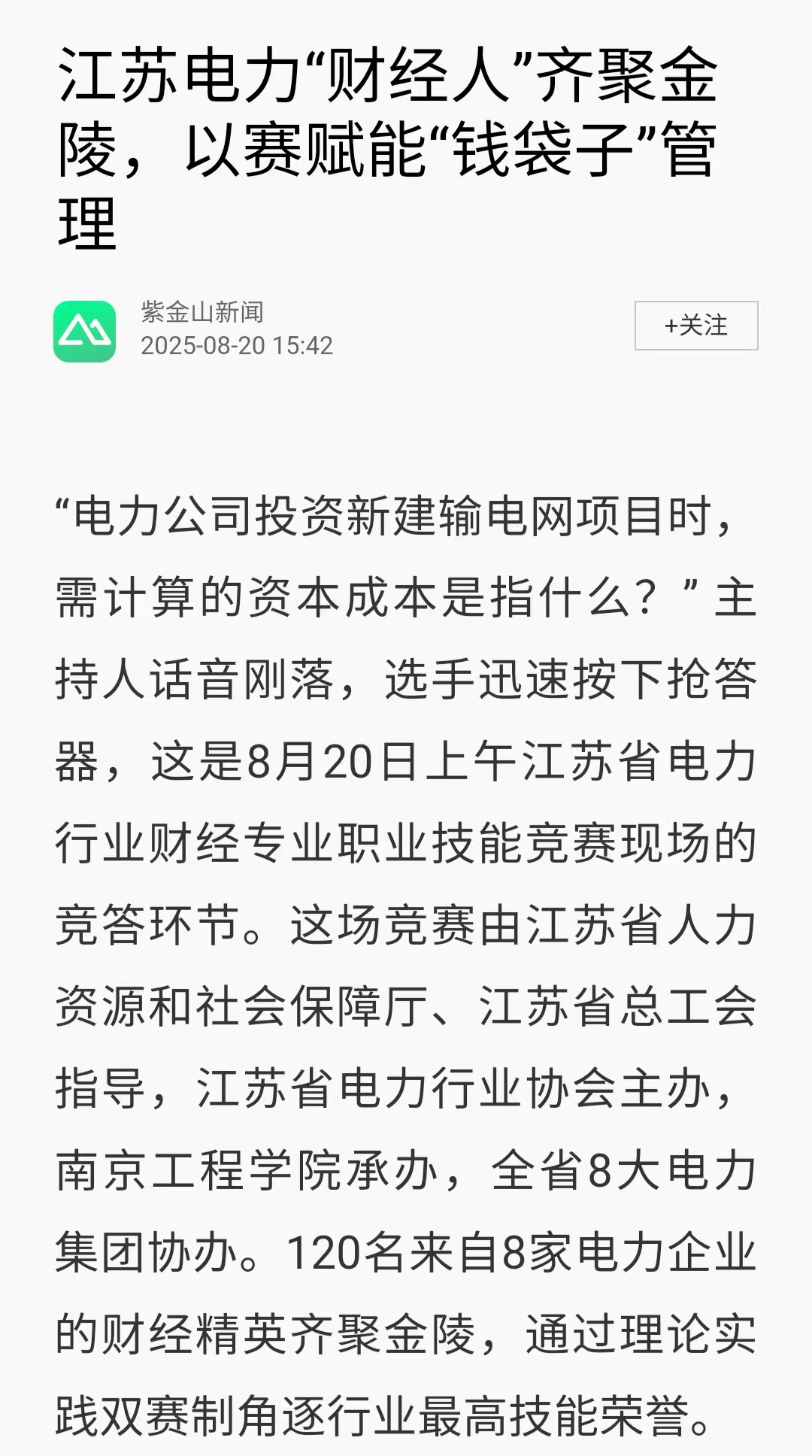 “电力公司投资新建输电网项目时,需计算的资本成本是指什么?” 主持人话音刚落,选手迅速按下抢答器,这是8月20日上午江苏省电力行业财经专业职业技能竞赛现场的竞答环节。这场竞赛由江苏省人力资源和社会保障厅、江苏省总工会指导,江苏省电力行业协会主办,凯发k8官网承办,全省8大电力集团协办。120名来自8家电力企业的财经精英齐聚金陵,通过理论实践双赛制角逐行业最高技能荣誉。