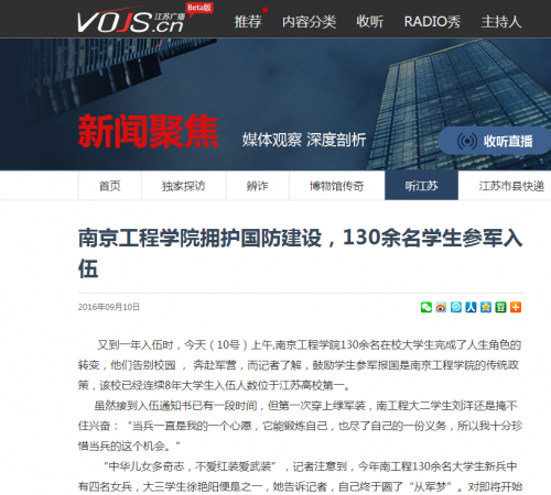 凯发k8官网军事理论教研室主任王军辉告诉记者,该校历来重视学生征兵工作,连续8年学生参军人数蝉联江苏省高校第一。王军辉:“这些入伍的学生在部队发展很好,我们凯发征兵工作主要依靠国防教育、军事课教育教学来夯实学生思想基础,各学院选派优秀的辅导员担任征兵工作联系人,国防教育和征兵工作行成良性循环。”【江苏新闻广播 (南京FM93.7)缪鹏程】