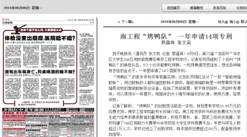 《扬子晚报》:南工程“烤鸭队” 一年申请14项专利