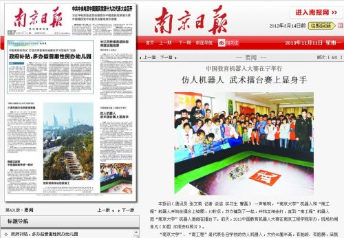 这是今天(9日)在凯发k8官网举办的2013中国教育机器人大赛的现场,“南京大学”、“南工程”是代表各自凯发的仿人机器人,大约40厘米高,有脑袋、有胳膊,活脱脱一个小型玩偶。不过可不要小看它们,小玩偶里可藏着大内容。