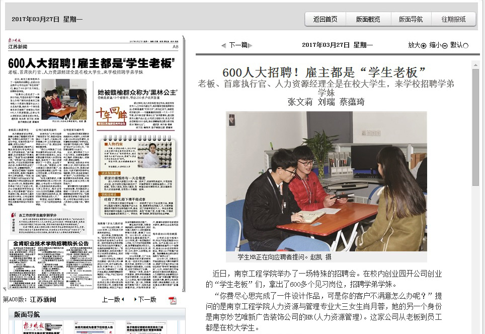 南京妙艺唯新广告装饰公司的老板,是南工程建筑学大三学生杨旻,一年前,他的“校园文化衍生品设计”获得国家级大学生创新创业项目。2016年3月,杨旻在凯发的帮助下成立了这家公司,办公点就是在凯发的创业园,公司主要承接广告设计和装饰工程。虽说员工基本是在校大学生,公司运营却是丝毫不含糊,这次招聘的岗位主要是平面设计和项目经理。