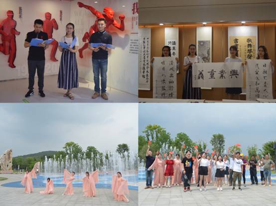 为庆祝新中国成立70周年,展现青春风采,丰富社区文化,7月5日至8日,经济与管理学院“青春追梦人”实践团队在汤山街道新时代文明实践所、东山社区、阜庄社区等地开展文艺汇演进社区活动。“家是最小国,国是千万家!”小合唱《国家》高亢振奋、扣人心弦,古典舞《洛水伊人》曲声宛转悠扬。活动现场,同学们伴随悦耳动听的曲声翩翩起舞,舞姿韵味十足,尽展古典之美;林慧、陈竞宇及张明煜老师声情并茂、铿锵有力的诗朗诵《我的祖国》,深深感染着在场观众;该院学子还现场挥毫写字,笔势雄健洒脱,书写下心中对祖国的热爱。文艺演出结束后,实践团队成员还开展了参观调研活动。同学们步入乡村振兴学习堂、道德讲堂和文化礼堂等进行乡贤文化精神的学习。在阜庄社区中,社区负责人与师生一起开展了传统文化、红色经典与美丽乡村共荣共促的讨论会,大家积极发言,现场气氛热烈。会后,同学们还开展《习近平总书记系列重要讲话读本》的集体学习。活动结束后,同学们还将此次活动剪辑成快闪视频,希望将青春风采与爱国情怀感染到身边的每一个人。
