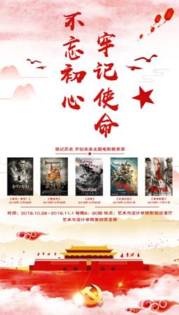 为扎实推进“不忘初心、牢记使命”主题教育,进一步增强党组织的凝聚力和战斗力,教育引导广大师生群众坚定理想信念、勇于担当作为,同时为了响应主题教育期间党员要积极参加志愿服务,为身边群众办好事的号召,艺术与设计学院学生第四党支部全体党员利用10月28日—11月1日晚间空余时间,安排值班,在至美苑?设计楼影视动漫厅为全校师生播放红色主题电影,举办“铭记历史,开创未来”主题电影教育周活动。
