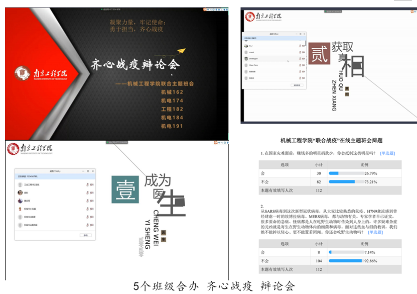 机电174、工程182等5个班级更是联合开展了“齐心战疫”线上辩论会。班主任们精心编制了一份调查问卷,涉及同学们对疫情防控知识、一线战疫英模、国内外防控政策比较、居家学习状况等多方面的认知和态度。根据调查结果,选取了“再给你一次机会,你是否愿意当医生?”“自媒体时代,民众离真相越来越远还是越来越近?”两个题目,由老师带队进行了线上辩论,同学们积极思考,各抒己见,期间深刻地理解了医生的职业精神,也对自媒体繁杂信息有了更多的独立思考。辩论赛的形式加深了同学们对社会现象的认识和理解,也增强了逻辑思辨能力和团队精神。