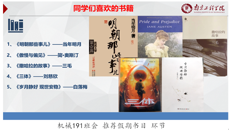 灵活运用多种云端手段,主题班会通过视频连线、语音会议等形式,增加互动性和趣味性,做到有声、有色,让参与的同学有得、有思。“云班会“还打破了传统班会“我说你听”的模式,每个同学都能通过麦克风变身主讲人。机械191的多名同学分享了自己假期里的阅读书目,李星男推荐荣获雨果奖的科幻小说《三体》,“在宏大的想象力后面,深藏着对宇宙的敬畏和生命的思考”。张子瀚欣赏《明朝那些事儿》,“三百年的风云变幻尽收眼底,小说的笔法让历史更加好读。”潘安则谈及散文集《撒哈拉的故事》,“在浓厚的异域风情中,三毛和荷西的爱情故事打动人心”。通过分享和讨论,大家更加坚定了要多读书、读好书的信念,努力提升工科学生的人文素养。
