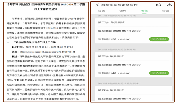 根据学生线上学习的情况,国教院在开学之初精心准备了两门MOOC“线上工作坊”课程---《科技创新与论文写作》和《英语核心能力提升(雅思篇)》作为学习补充。目的是通过有效利用慕课资源及相应的学生学习管理办法,指导学生在专业学习的同时不断提升综合素质和能力。同学们报名踊跃,积极参加工作坊的MOOC学习,完成每个章节的作业和测试。软工中外191班袁筱钰深有体会地说:“线上工作坊的开展使同学们学习的方式更加多元化,为许多同学提供了新的学习渠道。同学们可以随时随地得参与到学习过程中”。