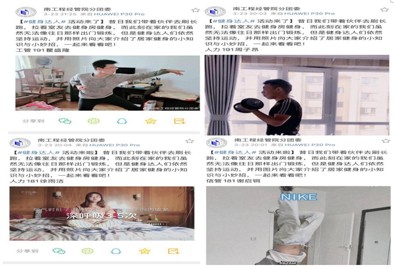 “健康达人接力赛”活动中,同学们通过手机或相机,以vlog的形式分享自己宅家锻炼健身的片段、向大家介绍健身的小知识与小妙招等,向学院微博投稿自己的健身视频或照片,同时在视频里@下一位接力的同学,被点到的同学需要继续接力下去,用运动张扬青春的力量。