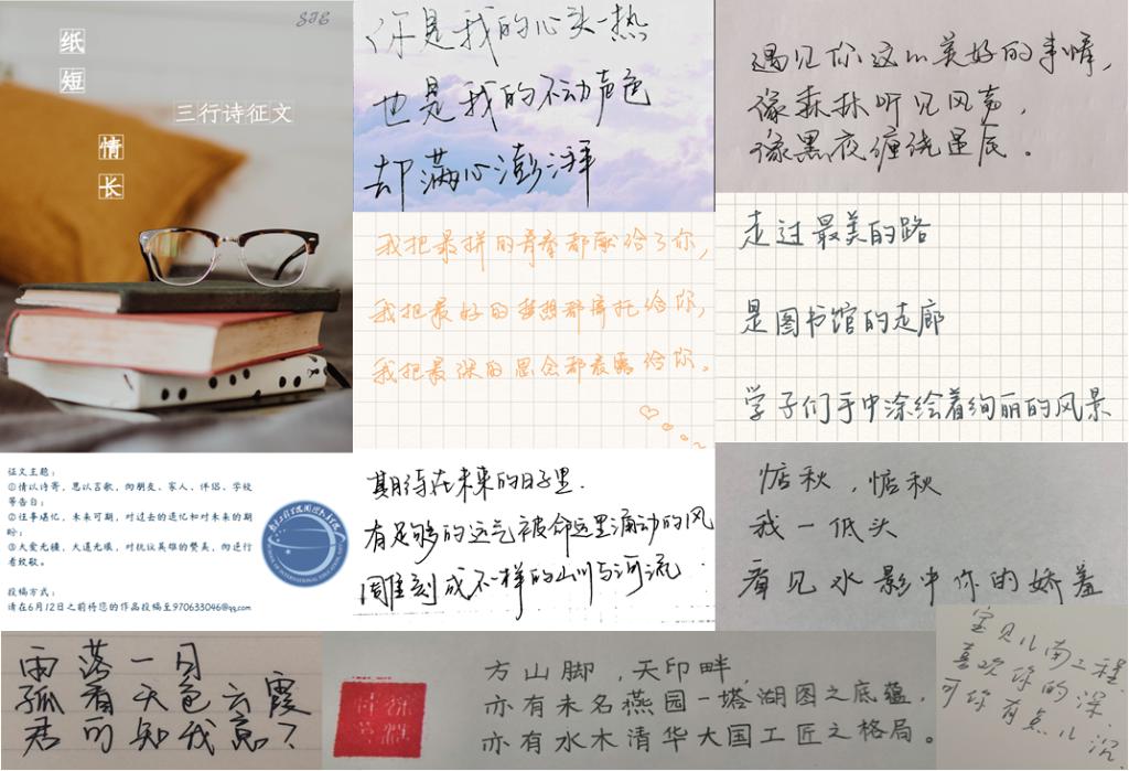 见字如面,文字最能表达一个人内心深处最真实的情感,该院开展了“纸短情长”三行诗大赛,鼓励学生拿起笔肆意挥洒心意。比赛开展后,学生们迅速响应,活动气氛热烈,纷纷在QQ空间、微信公众号、新浪微博等两微一端平台上留下自己的真情告白。有的情以诗寄,思以言歌,向朋友、家人、伴侣、凯发等告白;有的往事堪忆,未来可期,书写对过去的追忆和对未来的期盼;有的表达对抗疫英雄的赞美,向逆行者致敬。此外,同学们表达自我的方式也独具特色,有通过编写程序代码传递心情的,有用毛笔抒发内心的,有罗列歌单表达敬意的,各类方式丰富多彩,充满创意。