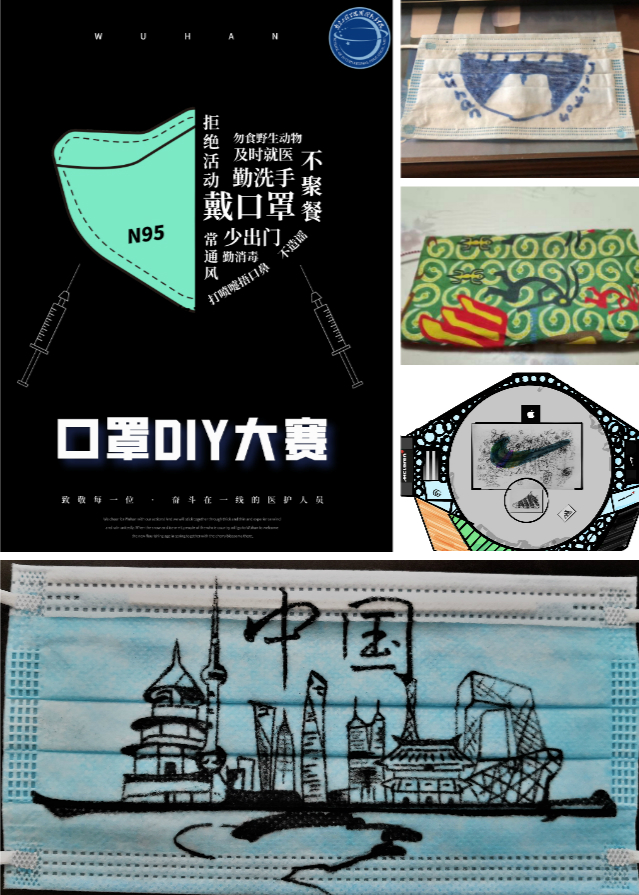 为普及科学佩戴口罩的相关知识,强调佩戴口罩的重要性,该院开展“小口罩、大创造”口罩DIY大赛。同学们纷纷响应,踊跃参加。有的在口罩上描绘笑脸展现积极心态,有的刻画中国大好河山展现大国风景,有的使用photoshop软件设计口罩样本,有的采用无纺布和棉料自制口罩……经过评比,杨竣淇的口罩作品“山海经”脱颖而出,他解释:“《山海经》中记载有异兽会带来瘟疫,也强调了仁义礼智信、重义轻利的生存智慧。但愿人们能从灾难中惊醒,铭记历史,不再重蹈覆辙。”