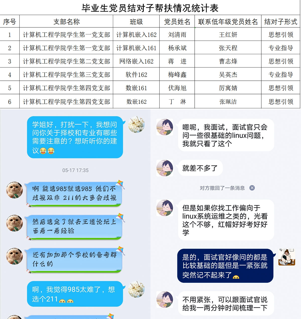 为充分发挥朋辈引领优势,帮助低年级学生明确考研、就业方向,该院毕业生党员们与低年级党员们开展结对子工作,分别从思想引领、专业解疑、学涯规划等方面对低年级党员进行一对一帮扶,发挥朋辈优势,与低年级党员共话学生党员的素养与成长。毕业生党员们通过分享鼓励同学们化理想为行动,夯实基础、大胆创新、在奋斗中释放青春激情,追逐青春梦想。