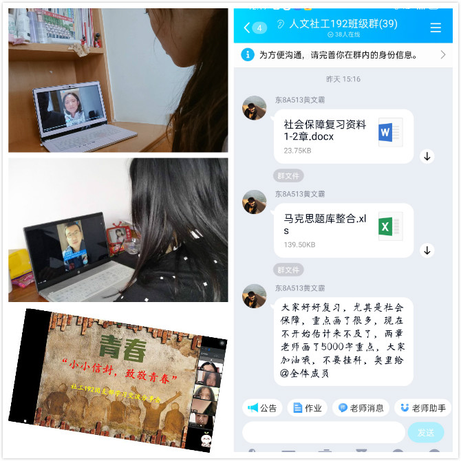 社工192第二班主任宋伶俐老师充分发挥学生的自主管理和自主学习能力,基于线上教学的特点建立师生协同学业指导模式。老师负责协调与监督,“学霸”负责提供学习资料、学习方法、答疑解惑等。同时,宋伶俐老师针对学业困难同学开展学业帮扶,了解他们的思想状态、学习状态和生活状态,集体帮助他们分析造成学业困难的思想原因、学习态度及学习方法、生活习惯等方面原因。让每一个被帮扶学生从思想深处下决心改变向好、端正学习态度、掌握良好的学习方法、改正不良的生活习惯,让每一个被帮扶学生都对自己的专业学习和未来发展确立合适的目标、树立信心并迎头赶上。
