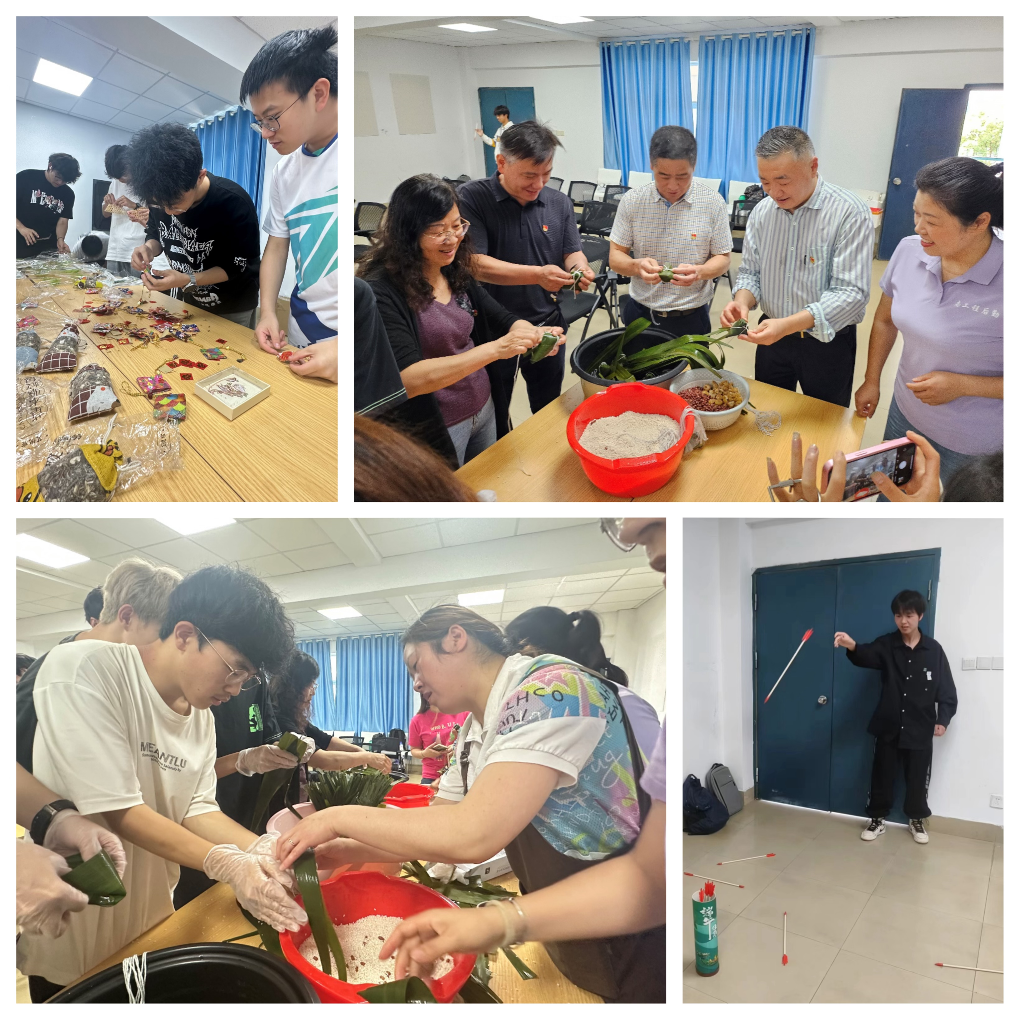 本次活动围绕端午节的风俗习惯、饮食文化、民间传说等方面展开,开展了手工制作艾草香囊、艾草花束、包粽子、投壶等活动。后勤保障党总支的老师们带来了包粽子所需的粽叶、粽线、糯米、蜜枣等材料,师生们一起学包粽子。同学们还制作了艾草香囊和花束送给老师,祈求平安和健康。