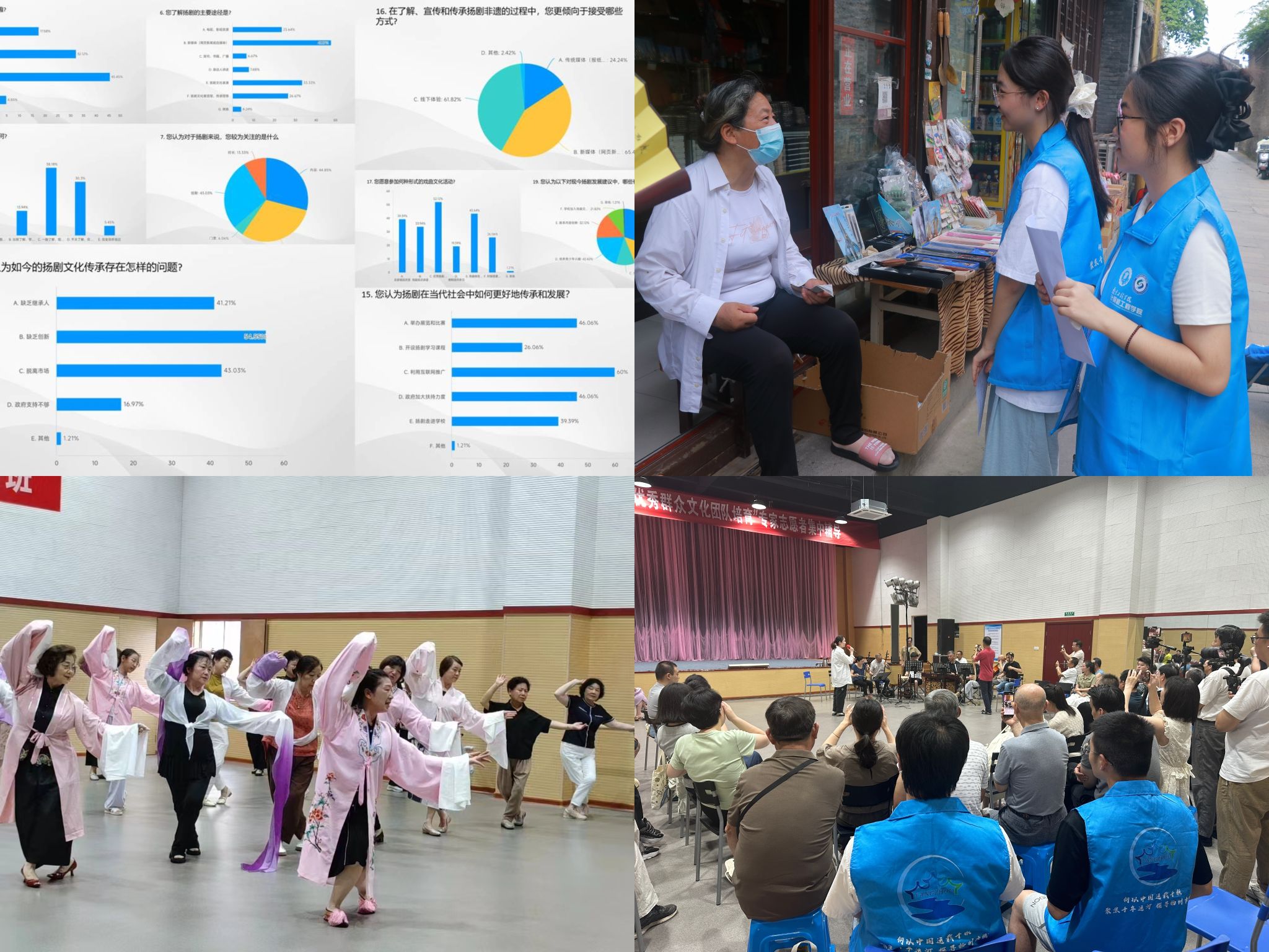 发布调查问卷,深入社区调研。调研团队线上发放问卷近千份,并通过现场访谈的方式,了解目前运河非遗文化的传播与普及情况。在扬州芍药园子书场,负责人戴杰热情接待调研团队,并与同学们介绍了当地非遗文化的发展、传承与保护问题;在扬州市江都区文化馆,实践团参加扬剧文化交流活动,“江都作为中国扬剧之乡,一直着力传统剧目的打磨提升和现代扬剧的创新编排。”扬剧团负责人戚女士这样说道。